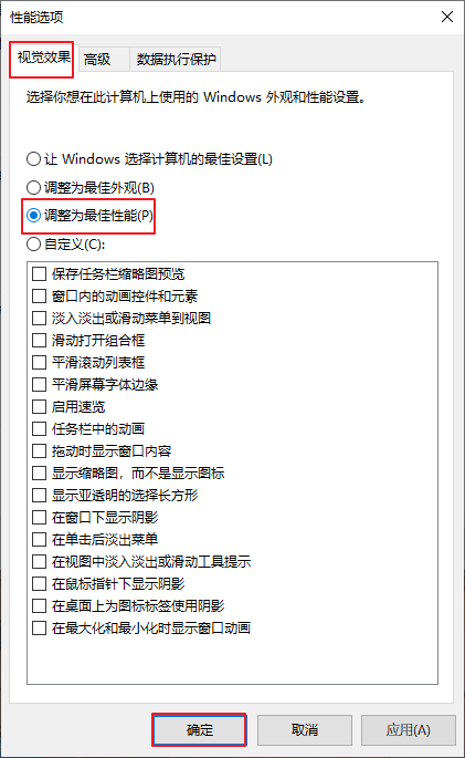 4、勾選“調整為最佳性能”,然后點擊“確定”,那么電腦就開啟了最佳性能模式啦!
