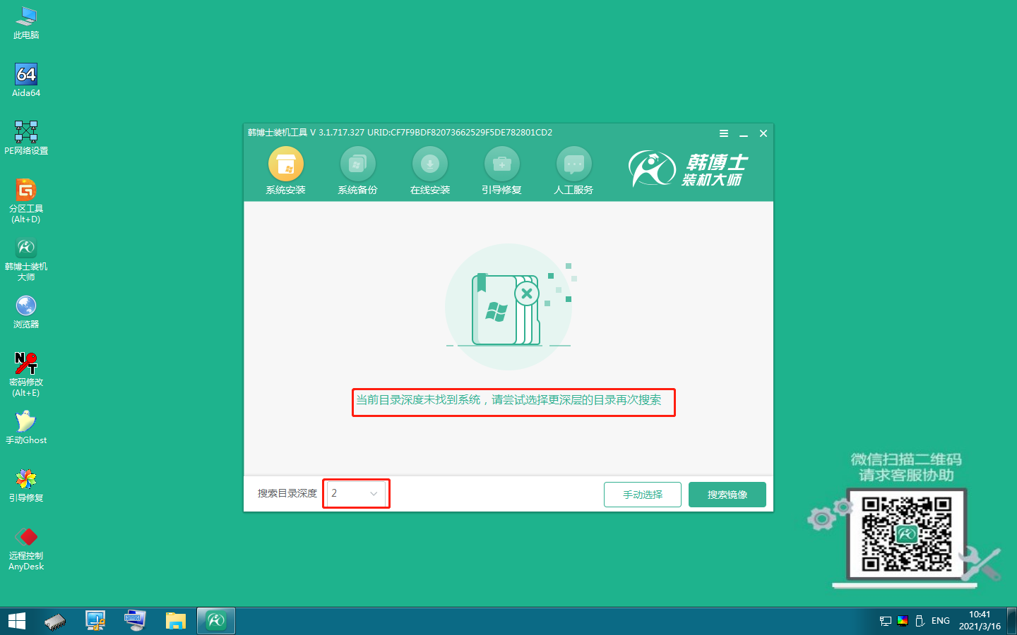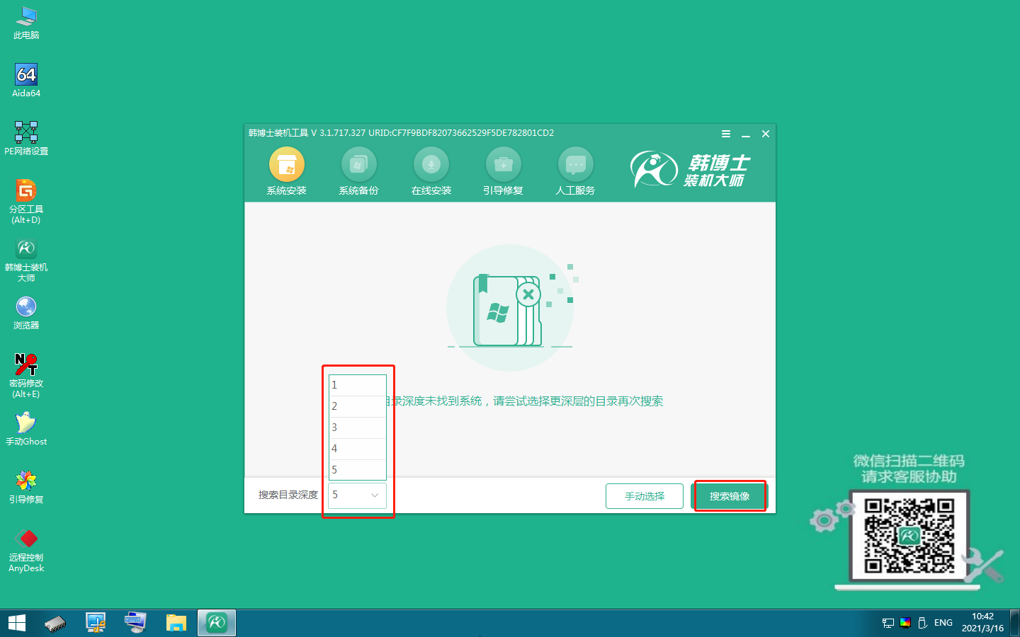 5.韓博士進入PE頁面,畫面提示未發現系統,我們可以“探索目錄深度”至“5”。