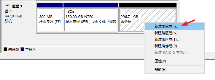 4. 當移動硬盤變為未分配空間后,再次單擊鼠標右鍵,選擇“新建簡單卷”