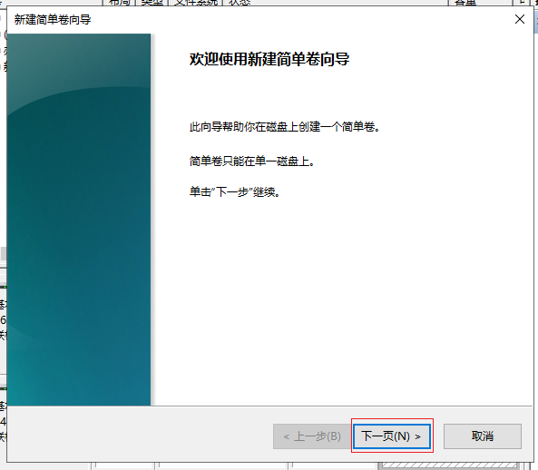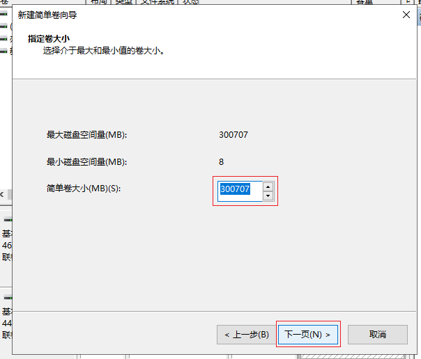 7. 在新建簡單卷大小中輸入想要的大小,點擊“下一步”