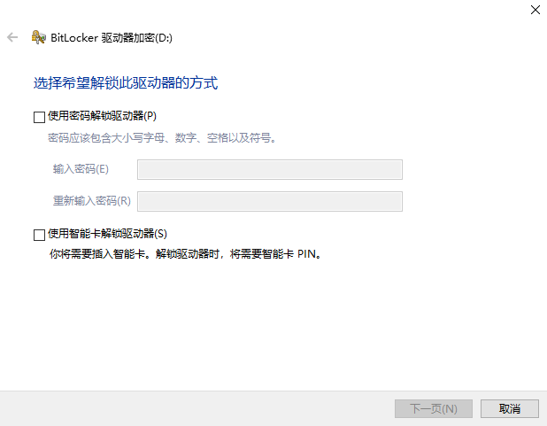 3.解鎖磁盤分區的方法有三種,常用的就是第一個輸入密碼解鎖,意思就是通過輸入的密碼來加密,解密同樣也是要輸入設置的密碼。