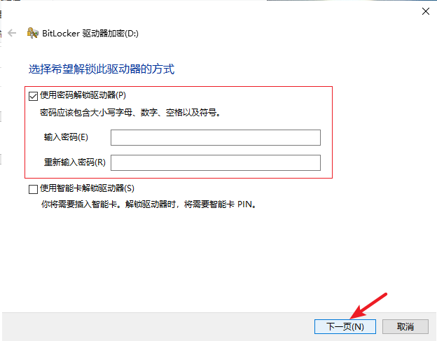 4.勾選“使用密碼解鎖驅動器”,然后輸入兩次密碼,注意密碼長度一定要是八位數。然后點擊“下一頁”操作
