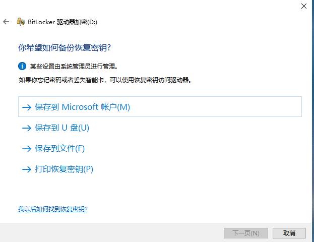 5.輸入密碼后系統會提示你選擇一種記住密碼的方式,一定要選的。密碼最好是保存到u盤或者直接打印出來,也可保存的別的分區。可以自行選擇然后點擊“下一頁”繼續