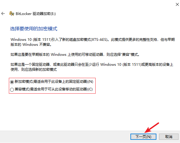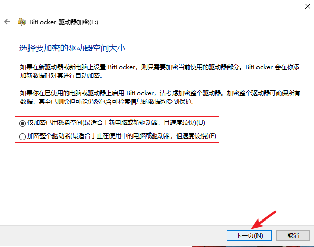 6.根據需要選擇加密的驅動器大小和使用的加密模式,開始加密