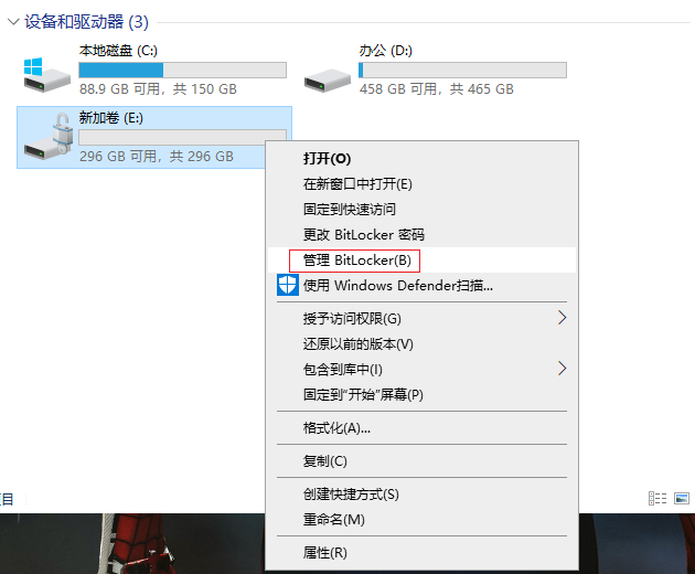 2.鼠標右擊要解密的磁盤,選擇“管理BitLocker(B)”