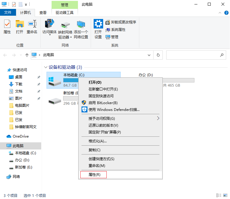2.點擊C盤。選擇“屬性”
