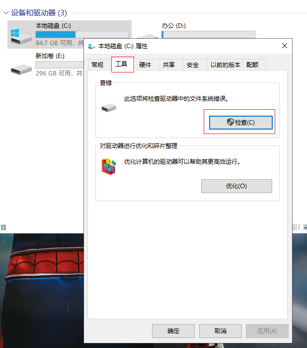 3.進入屬性界面,選擇“工具”,點擊“檢查”按鈕