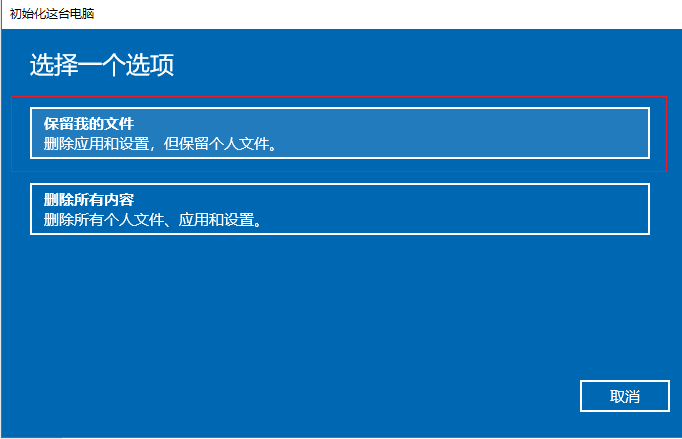 4.進(jìn)入重置界面,選擇【保留我的文件】