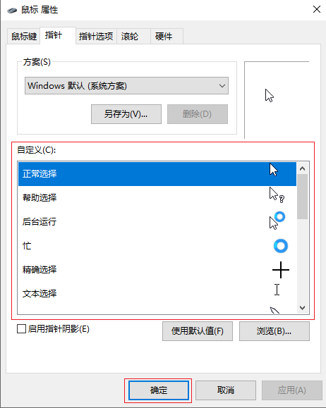 5.在自定義下選擇想要更換的指針,然后點(diǎn)擊【確定】即可