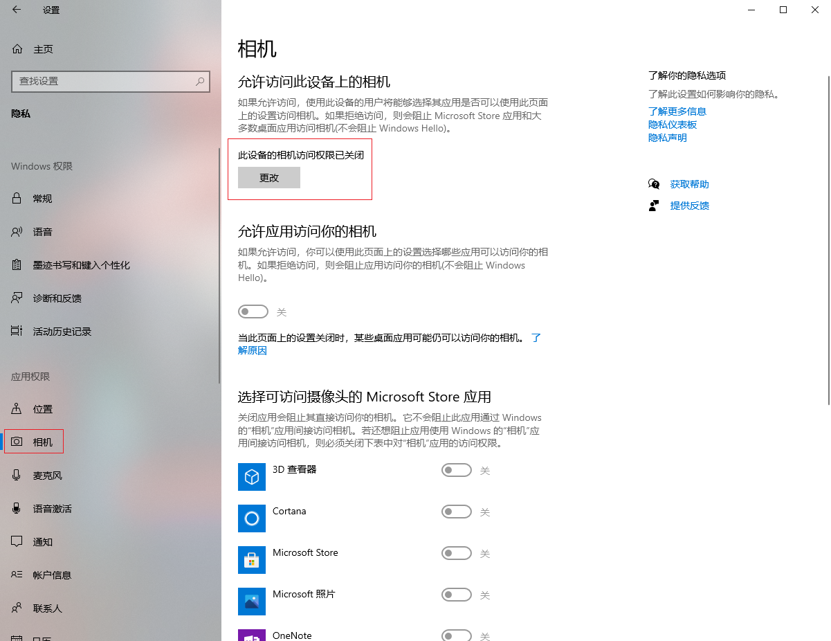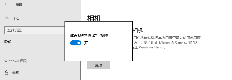 2.在左側選擇【相機】,然后在右側點擊【更改】把相機模式打開。