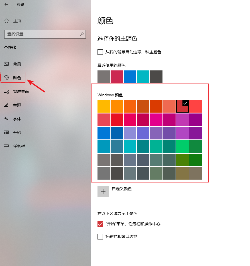 2.進入設置界面,在左側選擇【顏色】,右側下拉找到【Windows顏色】,然后選擇一種喜歡的顏色,再勾選下面的【“開始”菜單、任務欄和操作中心】即可。