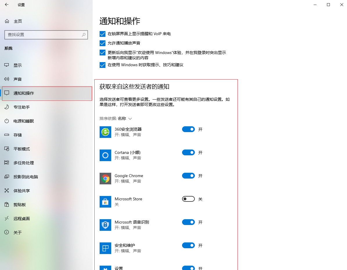 2.進入設置界面,在左側選擇【通知和操作】,然后在右側下拉找到【獲取來自這些發送者的通知】,在它下面把通知的相應圖標關了就可以了。