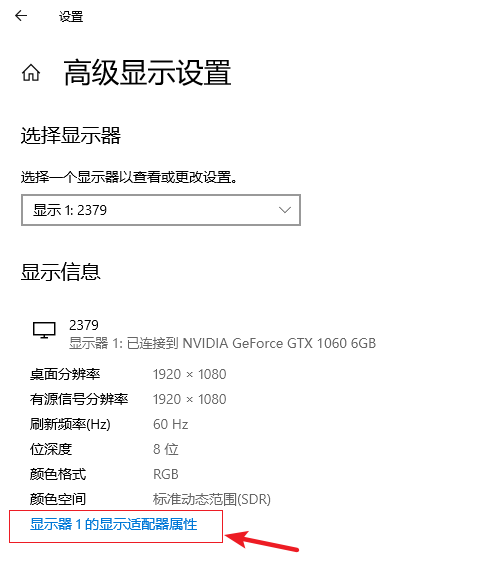 3.在高級顯示設置界面選擇【顯示器1的顯示適配器屬性】。