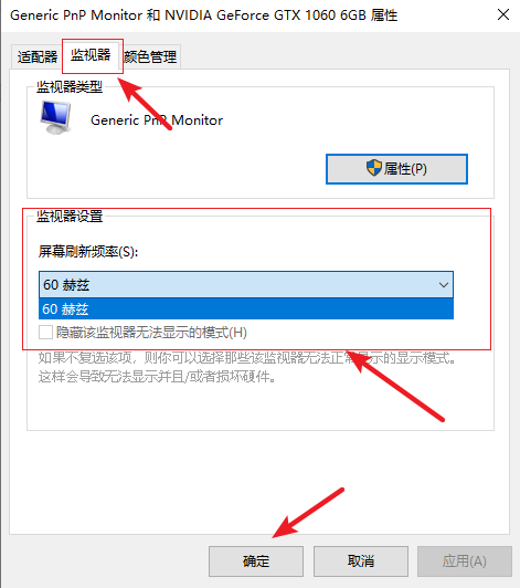 4.在屬性窗口上方選擇【監(jiān)視器】,然后選擇屏幕刷新率的數值,最后點擊【確定】即可。