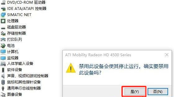 4.接著系統會提示設備將停止運行,點擊【是】按鈕,這樣集成顯卡就被禁用了。