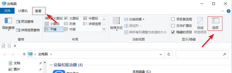 1.鼠標右鍵桌面的【此電腦】圖標,進入后選擇【查看】,然后點擊【選項】。