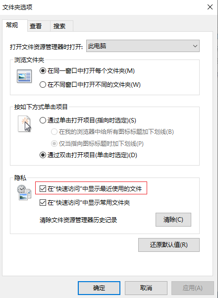 2.進入文件夾選項頁面,勾選【在快速訪問中顯示最近使用的文件】,點擊【確定】。