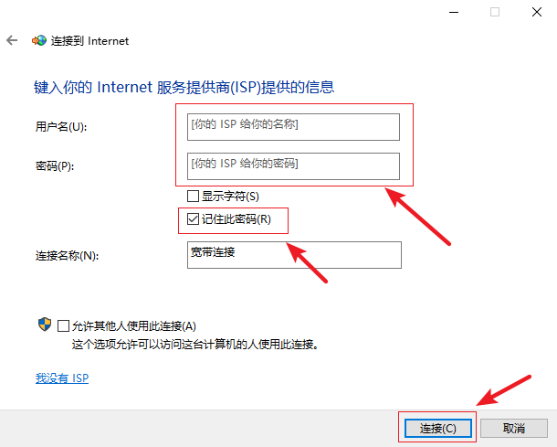 5.在以下頁面中輸入要連接的網絡的用戶和密碼,然后勾選【記住此密碼】,點擊【連接】。