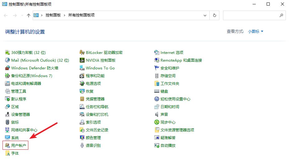 2.進入控制面板界面,選擇【用戶賬戶】。
