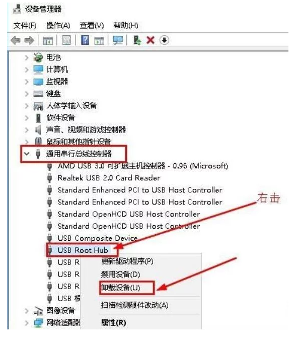 3.在設備管理器界面下拉找到并點開【通用串行總線控制器】,鼠標右擊【USB Root Hub】,選擇【卸載裝備】。