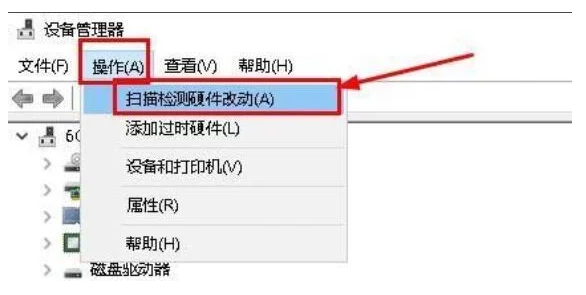 5.在上方切換到【操作】選項卡,選擇【掃描檢測硬件改動】。