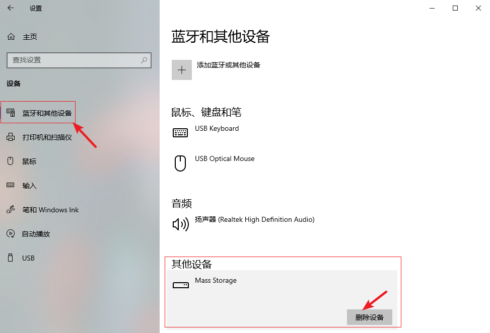 2.在左側選擇【藍牙和其他設備】,然后在右側找到U盤點擊【刪除設備】,最后再重新插入即可。
