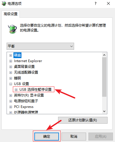 5.點開【USB設置】-【USB選擇性暫停設置】,將其設為【已禁用】,最后點擊【確定】即可。