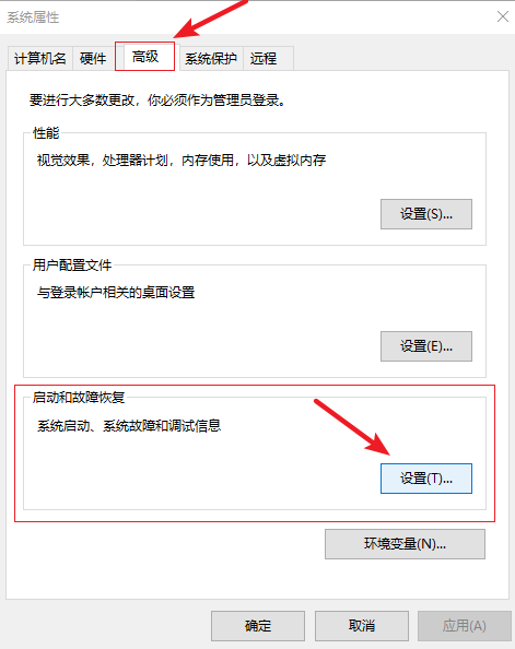 3.在系統屬性界面,把上方的選項卡切換到【高級】,然后在【啟動和故障恢復】下面點擊【設置】。