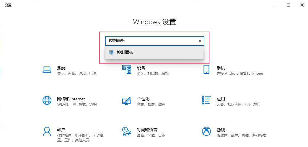 1.在鍵盤上按下【win+i】組合鍵,調出設置選項界面,在上方的搜索框輸入【控制面板】,然后點擊進入。