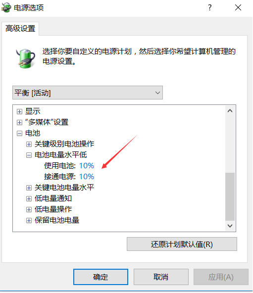 5.找到【電池】-【電池電量水平低】,然后將其設置高一點,比如10%或者更高(你認為電池電量低于百分之幾就需要充電了,你就將其設置為那個值)。