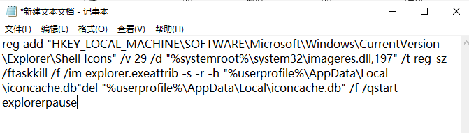 reg add "HKEY_LOCAL_MACHINE\SOFTWARE\Microsoft\Windows\CurrentVersion\Explorer\Shell Icons" /v 29 /d "%systemroot%\system32\imageres.dll,197" /t reg_sz /ftaskkill /f /im explorer.exeattrib -s -r -h "%userprofile%\AppData\Local\iconcache.db"del "%userprofile%\AppData\Local\iconcache.db" /f /qstart explorerpause