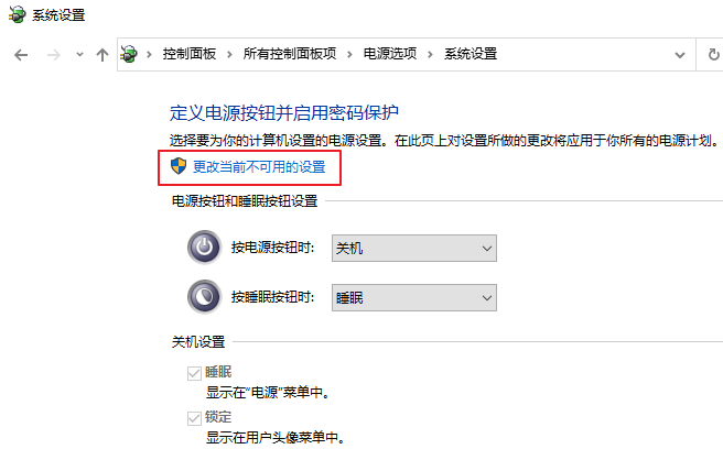 4.點擊【更改當前不可用的設置】,勾選【啟用快速啟動】,點擊保存修改即可。