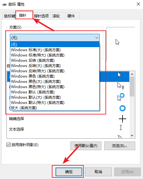 3.上方選項卡切換到【指針】,選擇想要的方案,最后點擊【確定】即可。