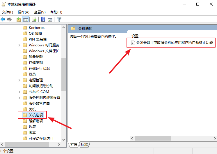 2.本地組策略編輯器,在左側(cè)計(jì)算機(jī)配置下依次點(diǎn)開【管理模板】-【系統(tǒng)】-【關(guān)機(jī)選項(xiàng)】,然后在右側(cè)雙擊【關(guān)閉會阻止或取消關(guān)機(jī)的應(yīng)用程序的自動終止功能】。