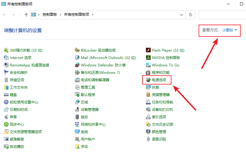 2.進(jìn)入后,把左上角的查看方式切換為【小圖標(biāo)】,然后找到并點(diǎn)擊【電源選項(xiàng)】。