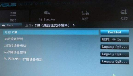 解決方法4:主板有csm項,但是是關閉(Disabled)狀態,進入BIOS設置,打開(Enabled)csm開關(如下圖)