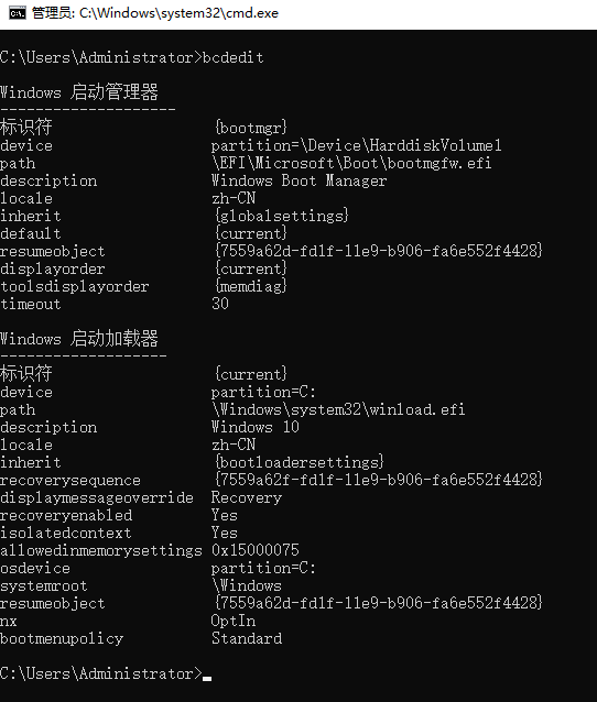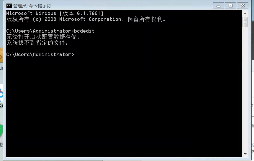 2.在命令提示符窗口輸入 ‘bcdedit’ ,查看是否能否打開這個(gè)文件