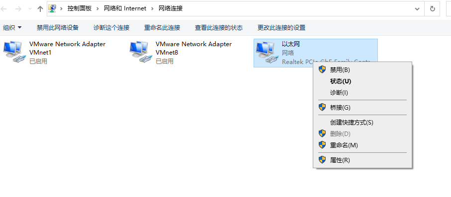 第五步- 右擊 正常使用的網(wǎng)絡(luò)設(shè)配器(小編目前是在使用網(wǎng)線,而另外兩個(gè)是虛擬機(jī)的虛擬網(wǎng)卡,所以就是右擊第三個(gè)),點(diǎn)擊屬性
