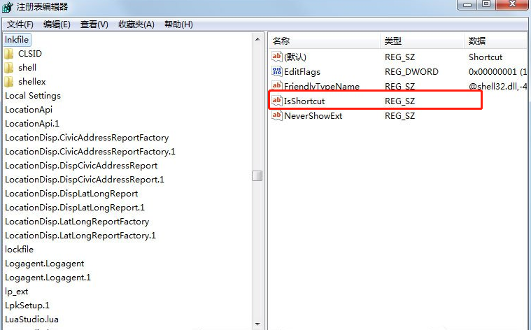 2.在打開的注冊表編輯器界面中找到“HKEY_CLASSES_ROOT”中的“lnkfile”,右鍵選中“isshortcut”并刪除,隨即重啟計算機即可生效。