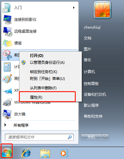 1.點擊“開始菜單”圖標,隨后右鍵點擊“截圖工具”選擇“屬性”進入。