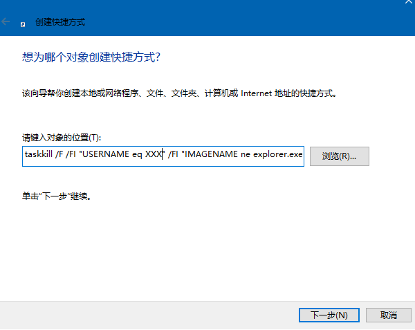 2.在打開的窗口中輸入:taskkill /F /FI "USERNAME eq 用戶名" /FI "IMAGENAME ne 程序名.exe" /FI "IMAGENAME ne dwm.exe,最后點擊下一步;