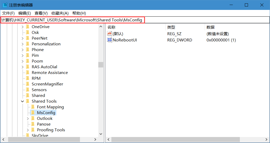 2.在界面中依次打開:HKEY_CURRENT_USER\Software\Microsoft\Shared Tools\MsConfig