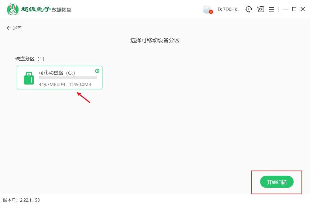 2.點擊選擇插入的移動硬盤分區(提前插入電腦的u盤),然后點擊開始掃描。