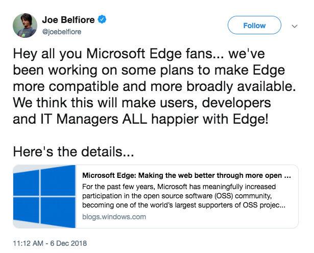 微軟Edge博客:通過更多開源協作使網絡變得更好今日,Microsoft Edge團隊在博客發文,宣布未來將采用 Chromium 內核開發桌面版 Edge 瀏覽器,以便為各平臺用戶帶來更好的兼容性,并為所有開發者減少 Web 碎片化。因此,微軟計
