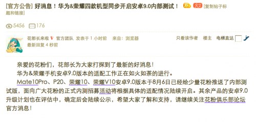 榮耀10、榮耀V10開啟安卓9.0內測,實力領跑全行業花粉論壇正式公布華為4款機型內測安卓9.0版本,榮耀手機兩款旗艦進入升級名單,分別是榮耀10、榮耀V10。據悉,此前8月6日,已經給少量花粉推送了基于安卓9.0版本的內部測試版系統,參與并配合研發一起