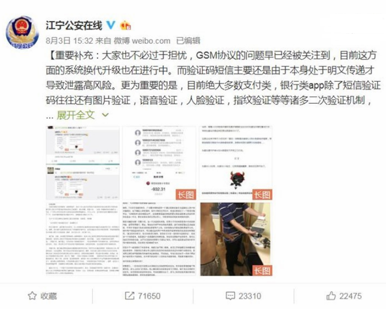 “截獲短信驗證碼”盜刷案頻發:手機處于2G狀態要小心如果你的手機突然長時間處于2G信號狀態時,那么你可要小心了。8月2日下午,南京江寧公安分局官方微博發布消息稱,一種名為“GSM劫持+短信嗅探技術”的犯罪手法是近兩年來出現的新型偽基站犯罪手段,多地警方