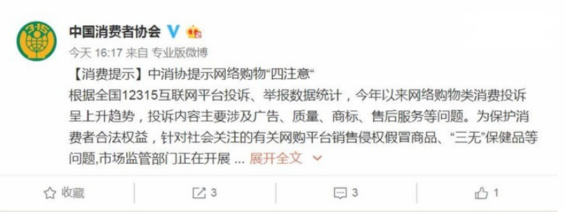 中消協提示網絡購物“四注意”:慎選平臺官微今天發布消費提示,提示網絡購物“四注意”,包括慎選平臺,理性消費;保存憑證,利于維權;收貨查驗,謹慎簽收;明晰權利,積極維權。下面是中消協消費提示全文:根據全國12315互聯網平臺投訴、舉報數據統