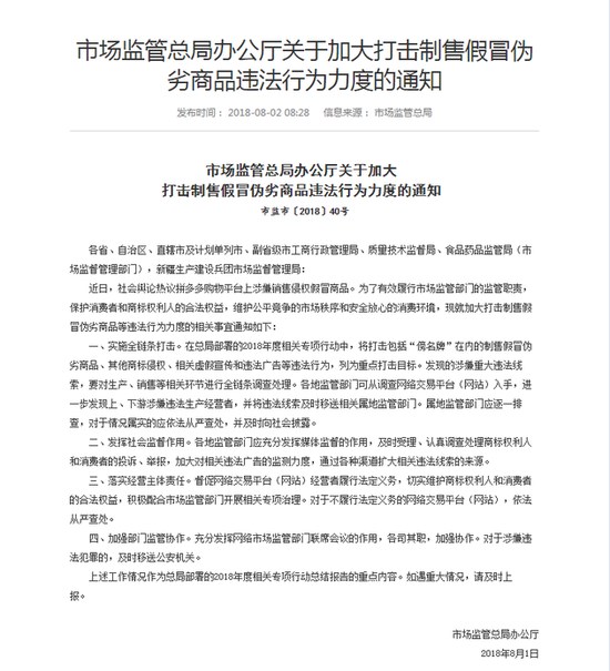 調查拼多多同時,市場監管總局:加大打擊制售假冒偽劣商品力度今天市場監管總局官網發布消息稱,近日,社會輿論熱議拼多多購物平臺上涉嫌銷售侵權假冒商品。為了有效履行市場監管部門監管職責,保護消費者和商標權利人的合法權益,維護公平競爭的市場秩序和安全放心的消費環境,