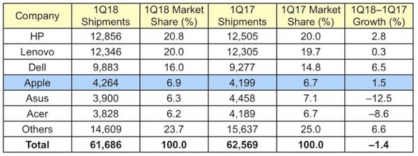 蘋果躋身成全球第四大PC供應商根據市場調查機構Gartner公布的最新PC出貨量評估報告,2018年全球PC設備出貨量持續下滑,但是蘋果的Mac設備銷量依然保持穩定。在2018年第1季度Mac產品出貨量大約在426萬臺,而去年同期