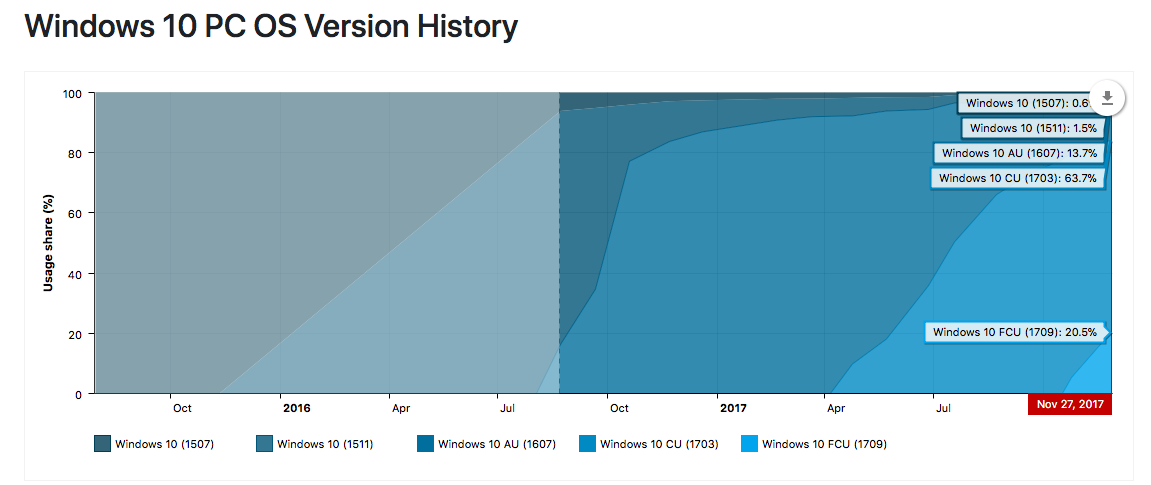 AdDuplex發布了最新的11月份Windows設備生態報告,在經過1個多月的發布和推送后,Windows 10創意者更新秋季版(1709)在整個Windows 10系統中的占比份額增長非常明顯,已